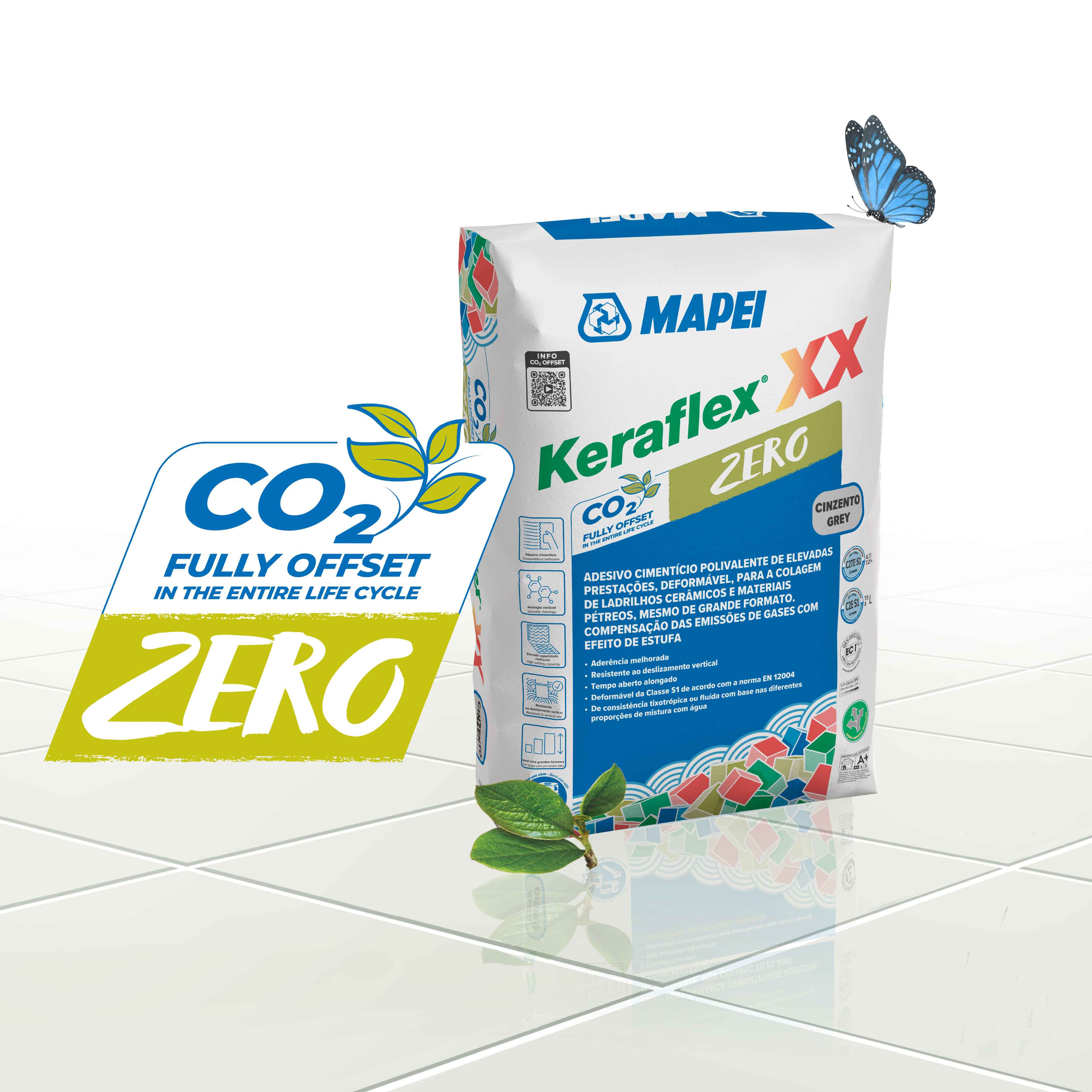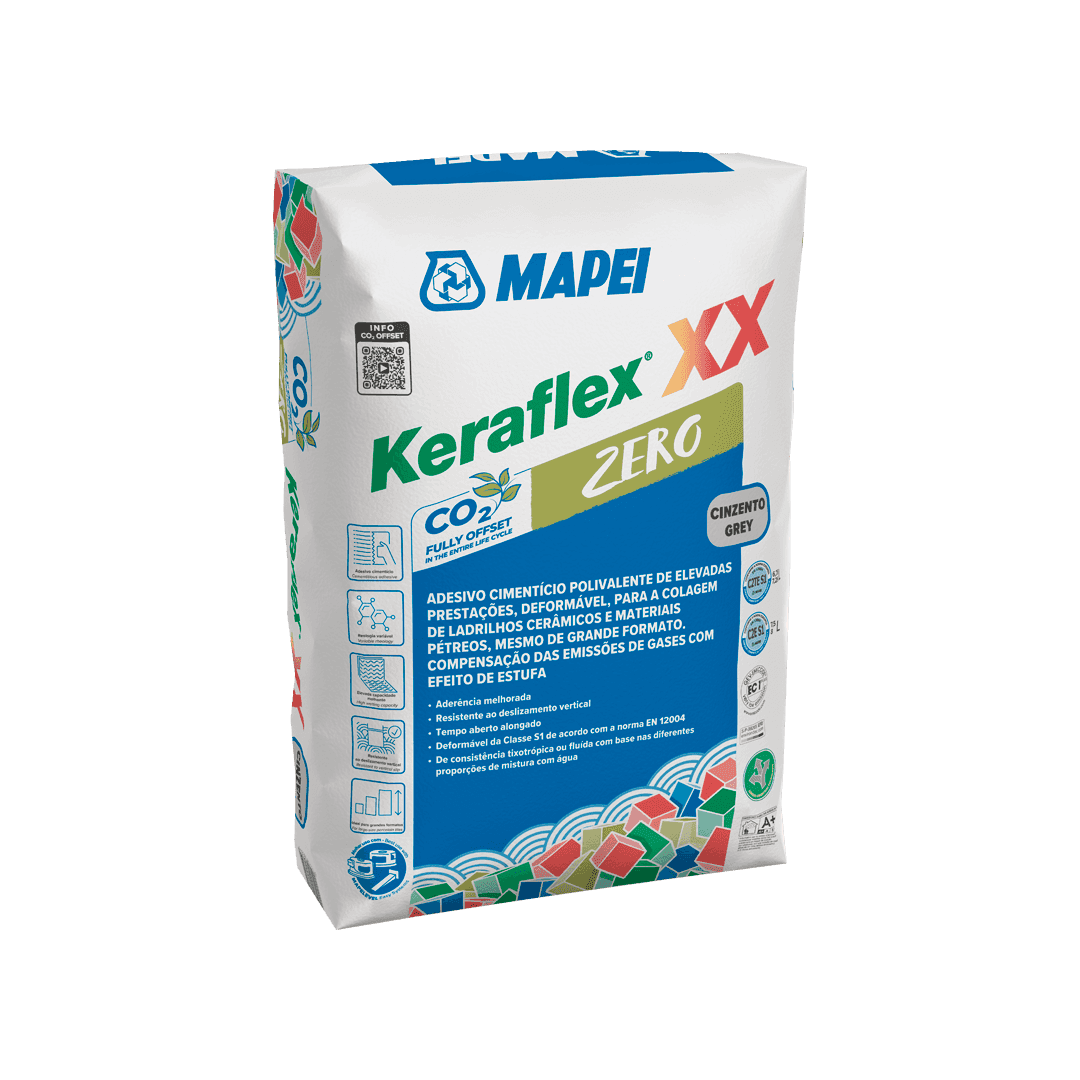 Adesivo cimentício polivalente indicado para a colagem em interiores e exteriores, em pavimentos, paredes e fachadas, de revestimentos em pedra e cerâmica, Keraflex XX Zero Mapei