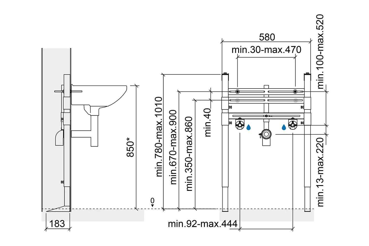 - Distância dos furos de fixação do lavatório regulável - 30 a 470mm
