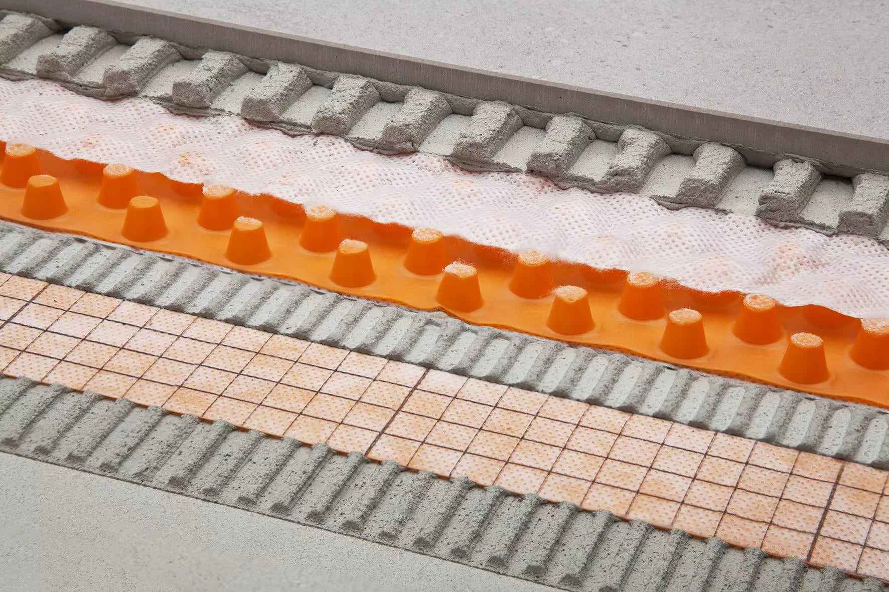 - Schlüter-DITRA-DRAIN 8 é constituída por uma película de polietileno indeformável, com um lado moldado em cone truncado e geotêxtil em polipropileno laminado em ambas faces.