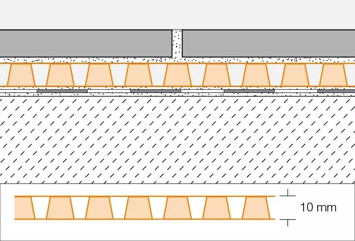 - O geotêxtil laminado na parte inferior é utilizado para a colagem do cimento cola, que é aplicado sobre a impermeabilização conjunta com um dentado (recomendação: 4 x 4 mm ou 6 x 6 mm) e embebida em DITRA-DRAIN 8 em toda a superfície.
