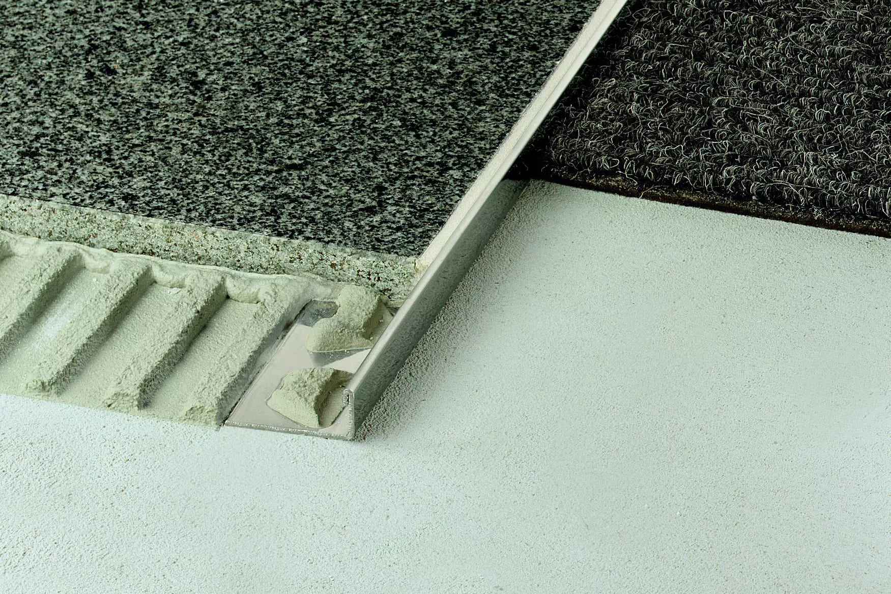 Nota: para a compensação das tolerâncias das medidas do material de revestimento, é possível avançar ou recuar ligeiramente o perfil na zona da parede. Na área do pavimento o perfil não pode sobressair da superfície do pavimento; é melhor ficar até 1 mm abaixo. - A cerâmica é aplicada no separador da junta, garantindo, assim, uma junta uniforme de 1,5 mm. Nos perfis sem separador de junta deve ser deixada uma junta com aprox. 1,5 mm de largura.
