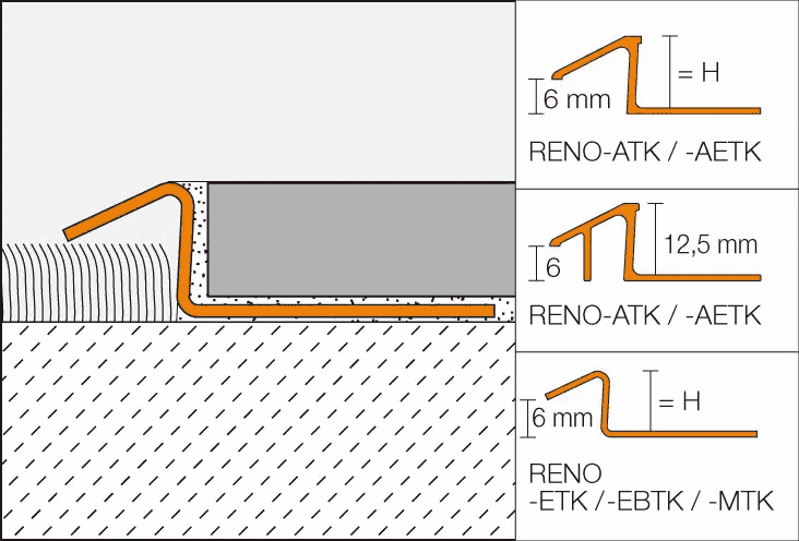 - Schlüter-RENO-TK deve ser selecionado de acordo com a espessura da cerâmica.