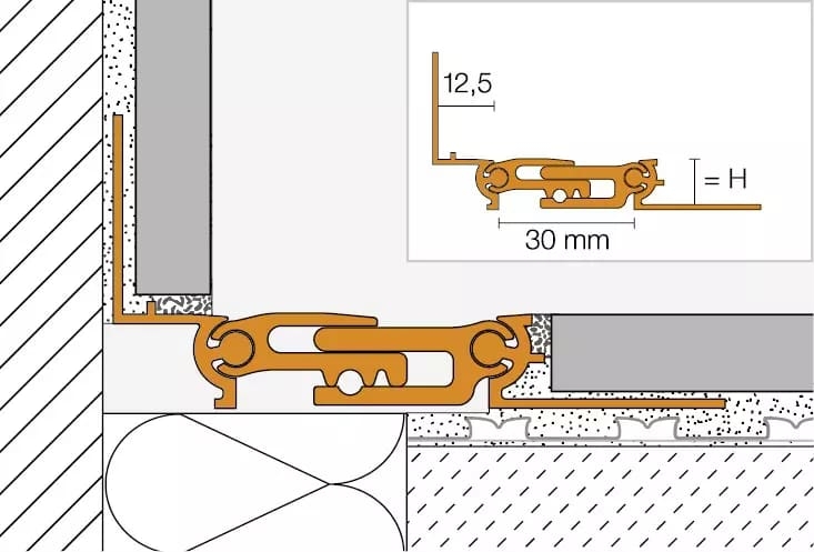 - O perfil está concebido de forma que a aba de fixação lateral pode ser ancorada na camada de cola por baixo de pavimentos em cerâmica ou pedra natural ou, em caso de utilização de outros materiais de revestimento, como por ex. alcatifa ou revestimentos plásticos, pode ser incorporada na camada de betonilha.